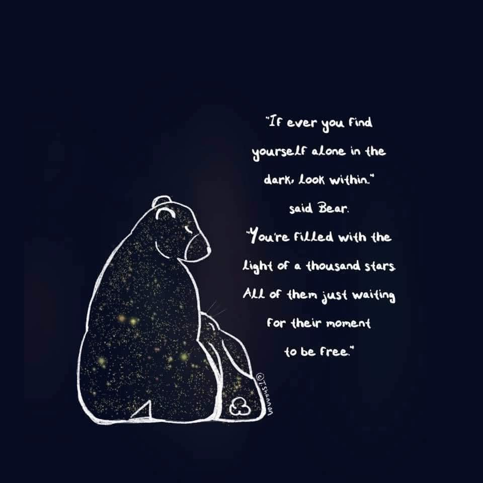 (Image: Rabbit & Bear sit side by side. The dialogue reads—“If ever you find yourself alone in the dark, look within.” said Bear. “You’re filled with the light of a thousand stars. All of them just waiting for their moment to be free.”)