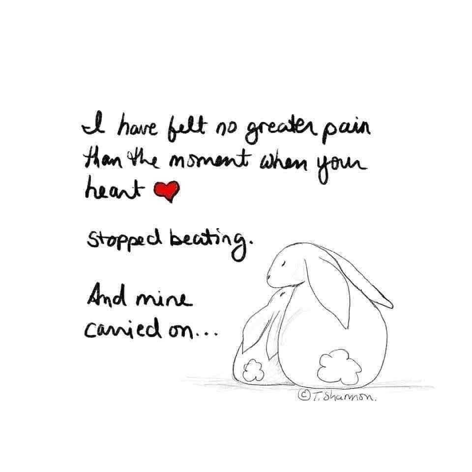 (Image: Rabbit sits snug against a smaller rabbit and the text reads— “I have felt no greater pain than the moment your heart stopped beating and mine carried on...”)